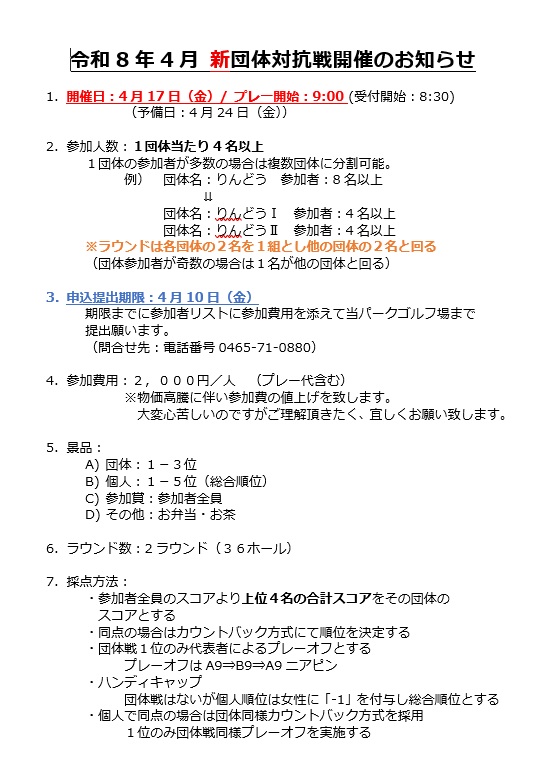 団体対抗戦開催by 管理人in イベントon 投稿日: 2026年3月28日2026年3月28日 4月17日に団体対抗戦を開催致します。 クラブの仲間・ご友人・自治会の仲間等で4名以上のグループを作成して参加してみませんか? 皆様のご参加をお待ちしております。 詳細は下記をご覧ください。
